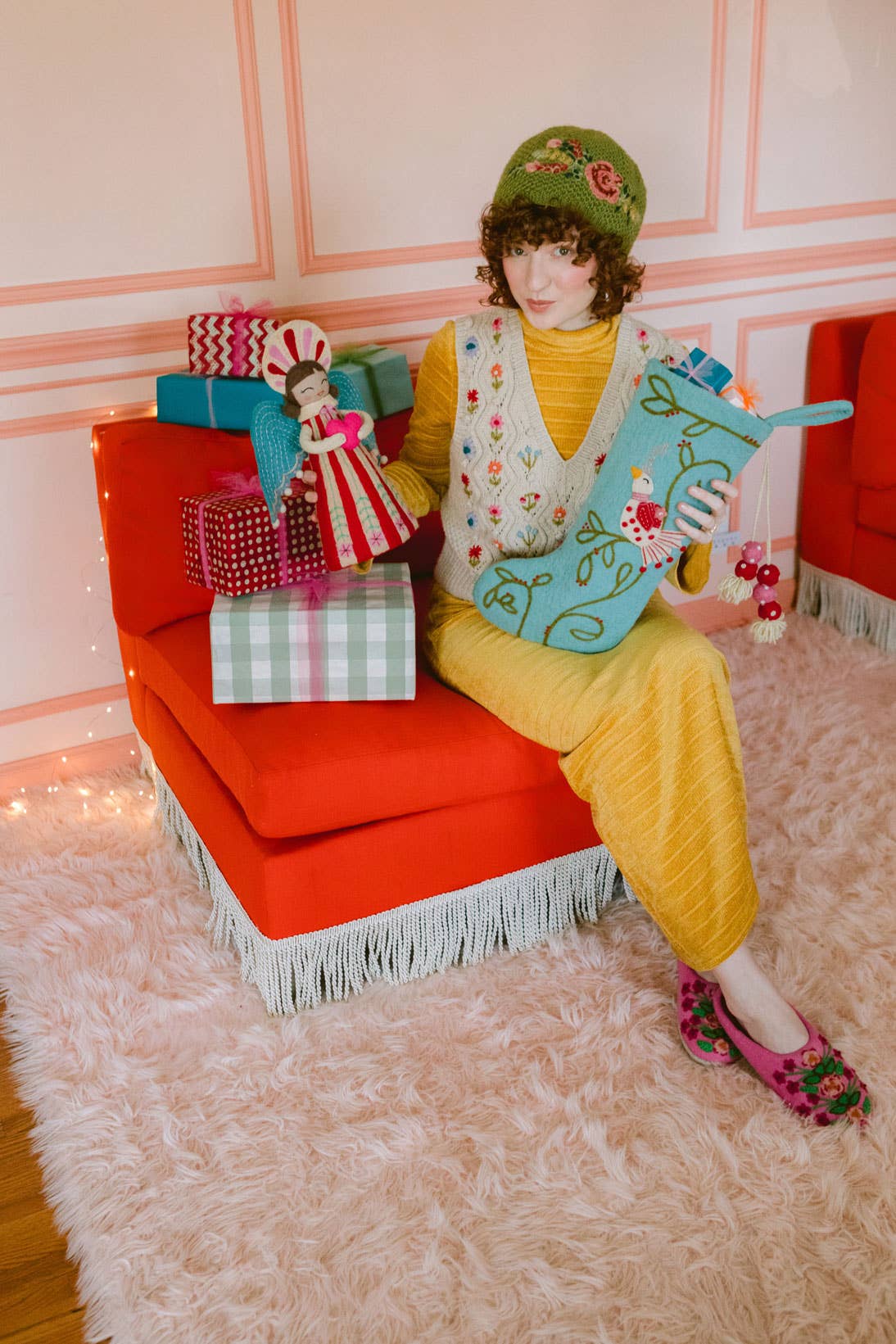 This majestic angel will add the perfect touch to your tree or mantle this holiday season. Accented with a beaming halo, vibrant wings, and hand-felted heart, this angel will bring a sense of love to your holiday décor. 14" tall. 100% felted wool.