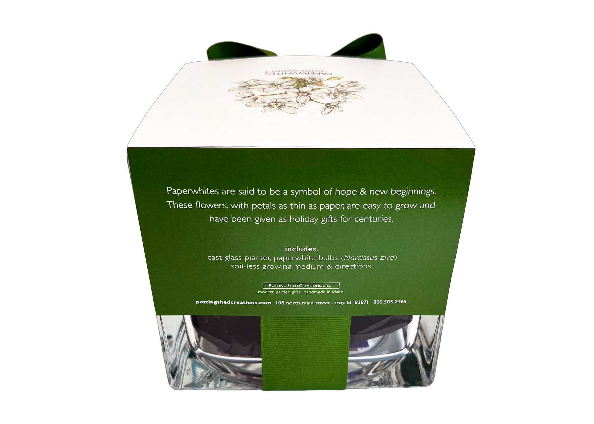 includes: cast glass planter with hand-tied grosgrain ribbon, paperwhite bulbs (Narcissus ziva), soil-less growing medium and directions . handmade in Idaho. Plant by 01/31/2026