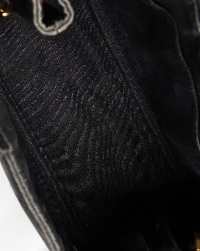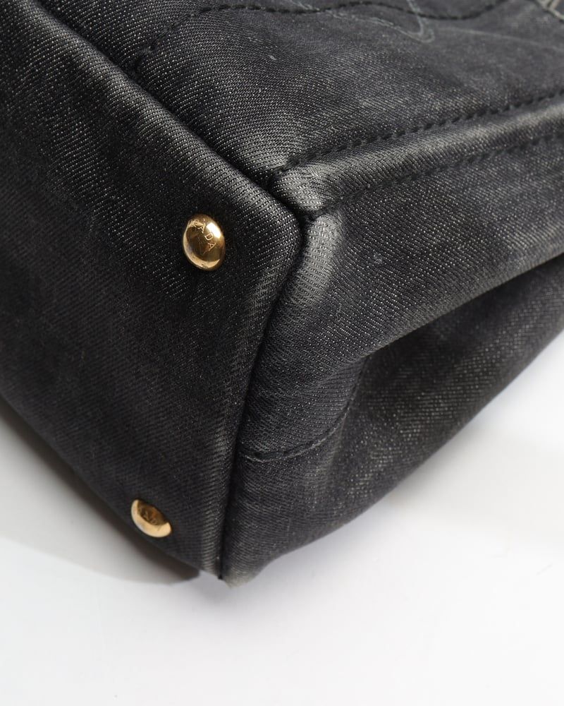PRADA Small Denim Canapa Bag - Gold-tone hardware - Black denim - Dual handles and detachable flat shoulder strap - Tonal lining with three pockets - Vintage Overall Preloved Condition: Very Good. Exterior Condition: Good. Wear at bottom corners. Faded colour. Interior Condition: Very Good. Light trace of use. Hardware: Shiny with scratches. Delivered with Detachable shoulder strap Made in Italy Dimensions: Height 19 cm Width 28 cm Depth 13 cm Handle drop 13 cm Shoulder strap drop 32 cm